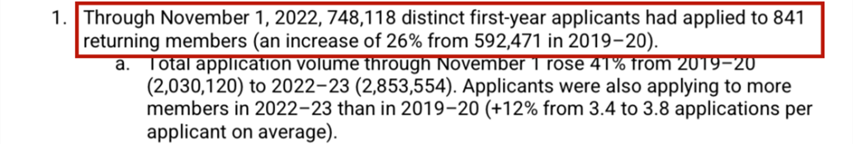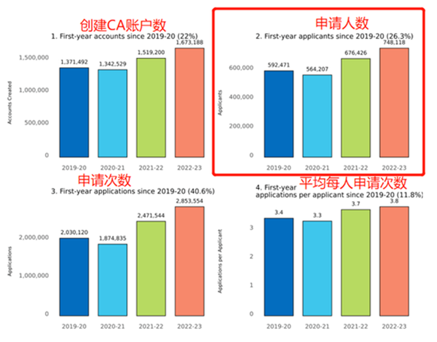 申请数量方面, 74 万+的申请人共提交了 2,853,544 份大学申请,总数比 2019/2020 申请季增长 40.6% ;每名申请人平均申请的学校为 3.8 所,比 2019/2020 申请季增长 11.8% 。