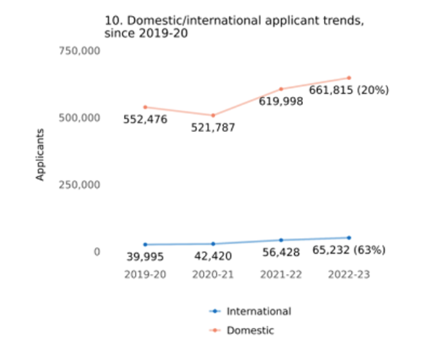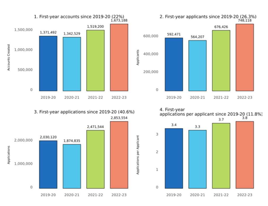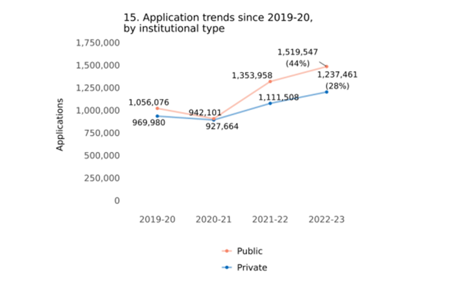 从 2019-20 年以来,申请公立大学的学生人数增长了 44% ,而申请私立大学学生的增长率为 28% 。这种趋势应该跟当前的经济形势有关,很多学生负担不起高昂的学费。