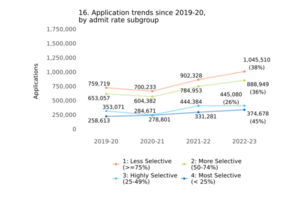 自 2019-20 年以来,录取率低于 25% 的大学收到的申请数量增加了 45 %。而增长率第二高的是录取率为75%及以上的大学,自 2019-20 年以来增加了 38 %。