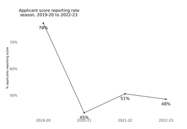 2022/2023 申请季, 48% 的申请人向美国大学提交了标化成绩。同时,免标化成绩政策实施 3 年以来,提交成绩的学生比例维持在一半左右。