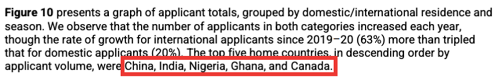 另外,虽然报告中没有详细说明每个国家的申请学生人数,但还是列出了几个国际生最大生源国,中国学生最多,其次是印度、尼日利亚、加纳和加拿大。