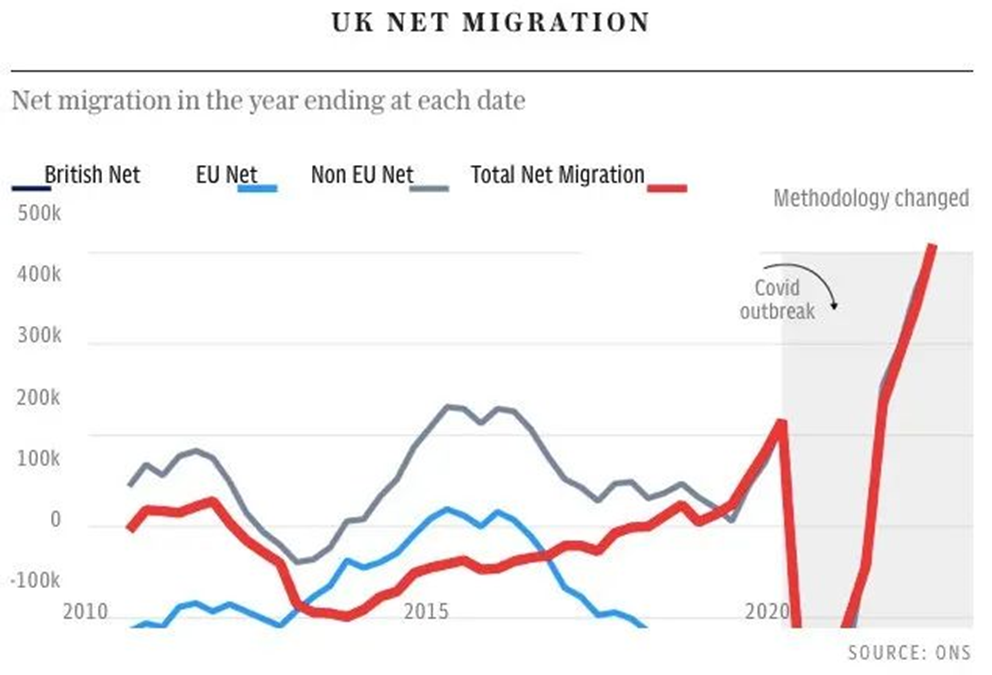 根据英国国家统计局( ONS )发布的数据显示, 2022 年英国净移民人数已达到 50.4 万,创历史峰值,远超英国脱欧前的 33.1 万人。截至 2022 年 6 月的过去一年内,共有 27.7 万名来自非欧盟国家的国际学生前来英国留学,而去年同期仅为 14.3 万人。