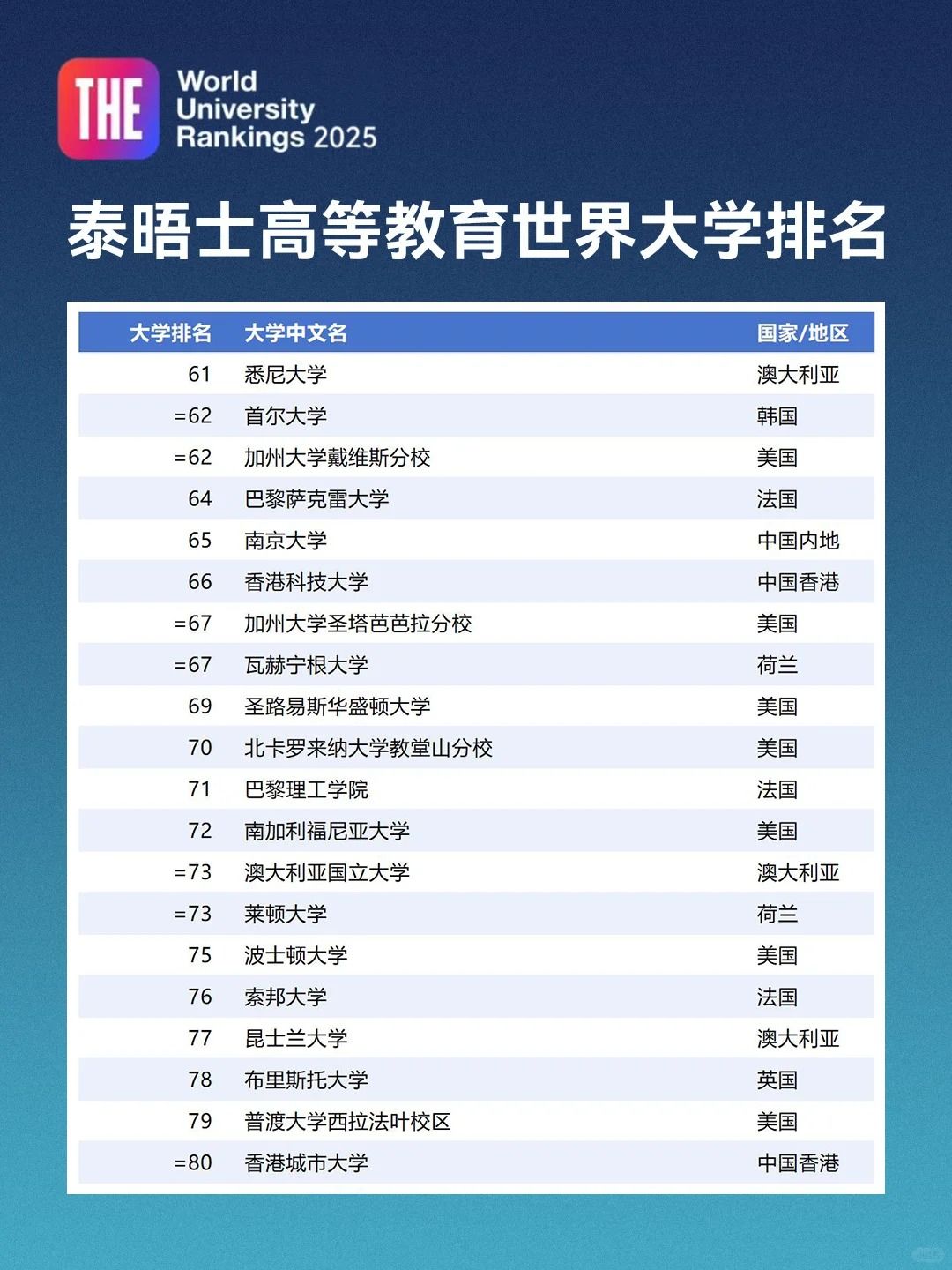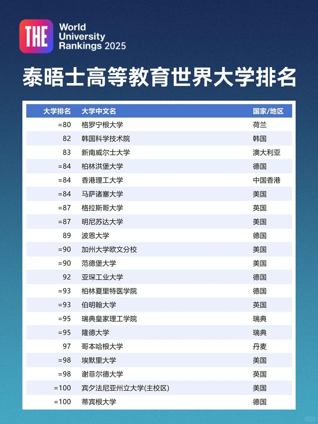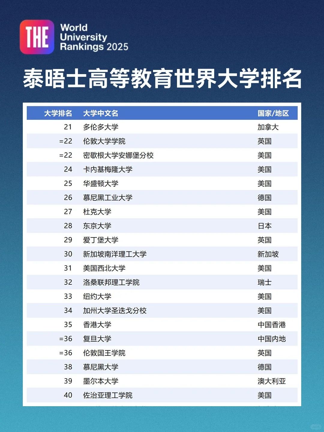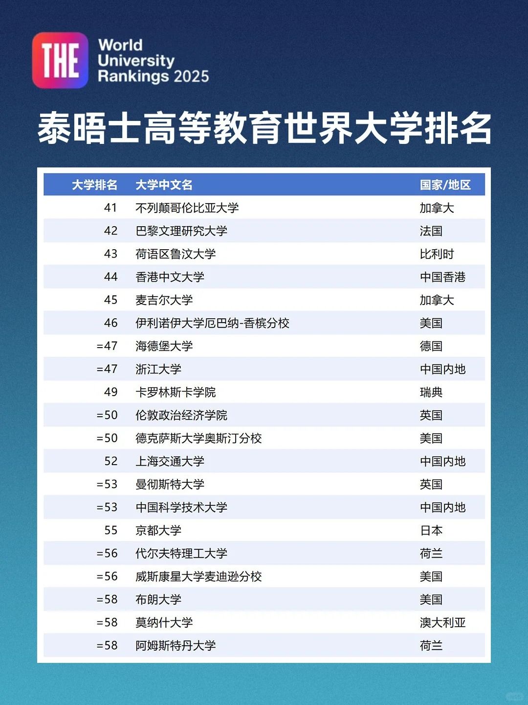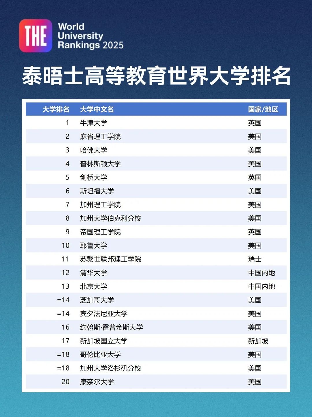 泰晤士高等教育世界大学排名》(英文:Times Higher Education World University Rankings)为一私人机构所发行之《泰晤士高等教育》周刊所为之世界大学排名。此周刊原本与QS公司合作,于2004-2009年期间联合推出《泰晤士高等教育-QS世界大学排名》,后于2010年拆伙,改与路透社及近期的爱思唯尔合作发表排名。发展至今,此排行榜囊括了世界综合、学科、声誉,以及亚洲及金砖五国两个地区性榜单。《泰晤士高等教育周刊世界大学排名》被形容为全球具影响力之大学排行榜之一。